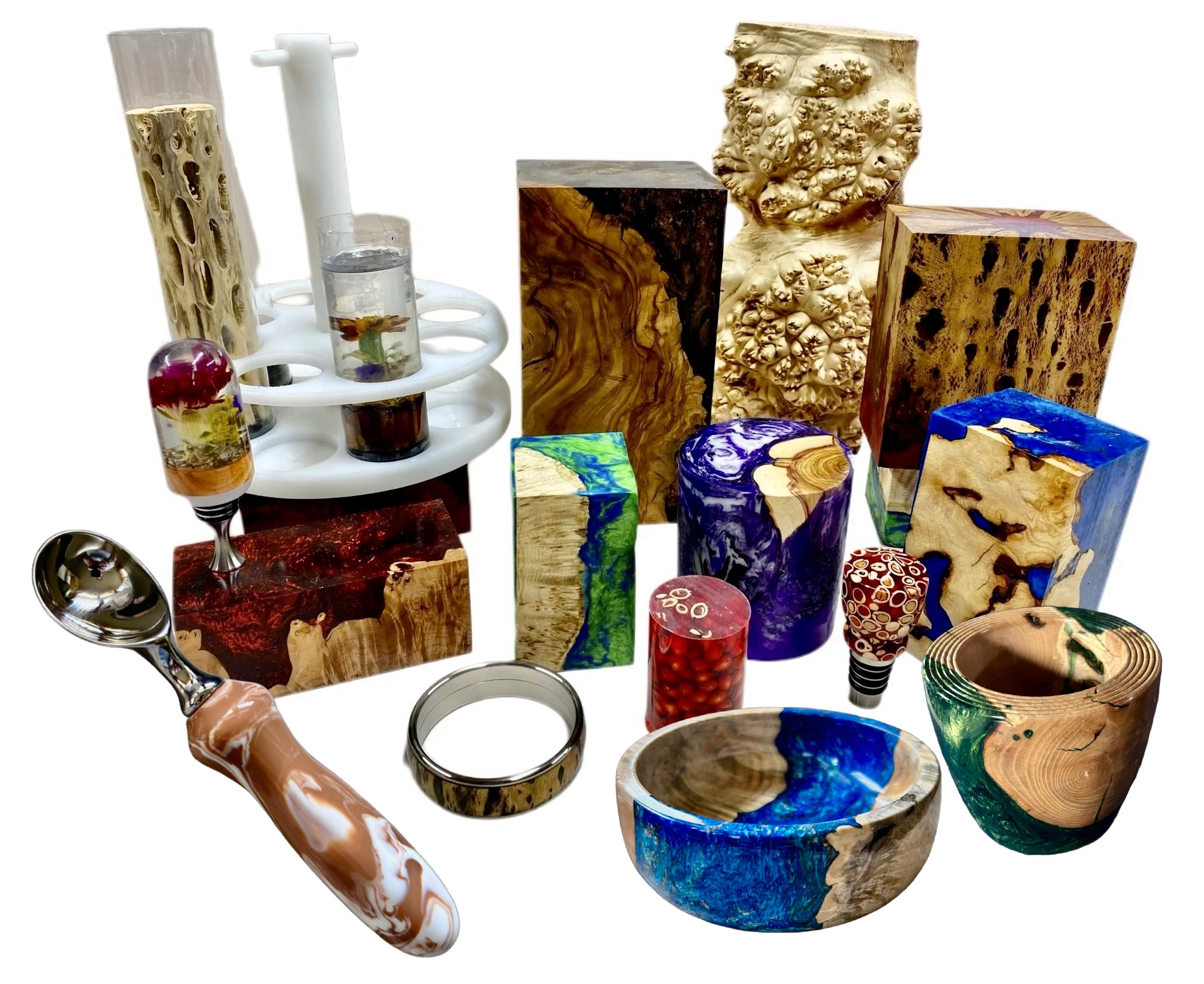 From small projects like rings and center bands to bottle stoppers, handles, small boxes, plates, and bowls, resin is another tool to expand what’s possible at the lathe.